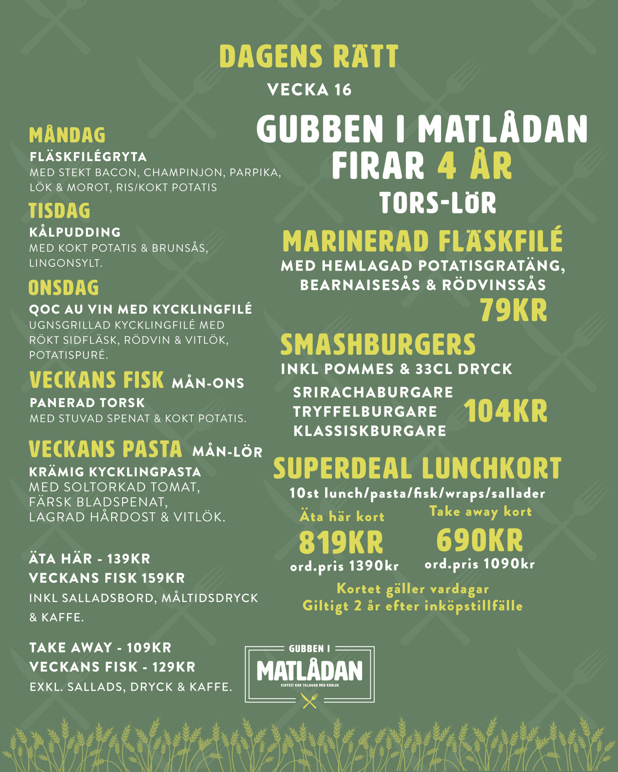Menyn består av klassisk husmanskost , fantastiska wraps, veckans fisk, veckans pasta, smashburgers på 180g svenskt hängmörad nötkött & andra goda rätter på á la carte menyn direkt från grunden i vår restaurang.
